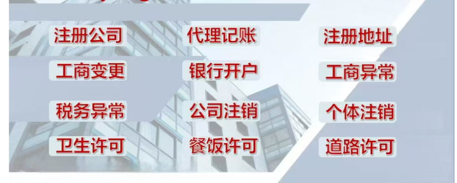 專業(yè)辦理人力資源公司、公司注冊,代理記賬,工商變更??,公司注銷,工商年檢,資質(zhì)認證,資質(zhì)辦理,公司變更,代理記賬,公司年報異常處理,行政審批,注冊營業(yè)執(zhí)照,外資注冊,稅務(wù)變更,環(huán)評,1年以上注銷,2年以上注銷,3年以上注銷,開票服務(wù),一般納稅人,,網(wǎng)絡(luò)文化經(jīng)營許可證,衛(wèi)生許可證,娛樂場所經(jīng)營許可證,生產(chǎn)許可證,醫(yī)療器械許可證,人力資源許可證,道路運輸許可證,建筑工程資質(zhì),辦學(xué)許可證,進出口許可證,危險品經(jīng)營許可證等。